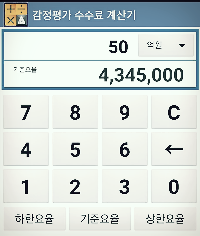 평가금액 50억원 기준, 약 435만원(실비 및 부가세 별도)