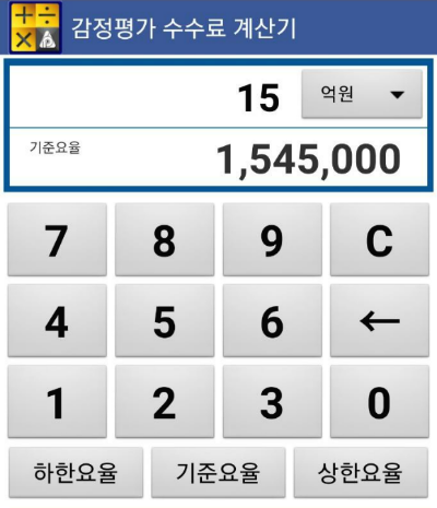 감정평가금액 15억원 부동산 기준, 약155만원(실비 및 부가세 별도)