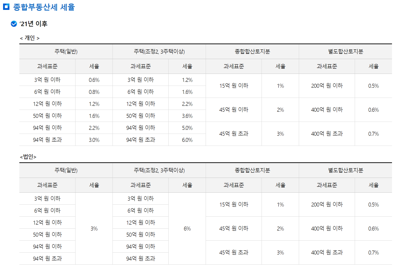 특히, 3주택 이상 및 조정대상지역내 2주택 이상 소유시 종전에 비해 세율이 2배 가까이 늘어 1.2~6.0%의 종합부동산세를 납부해야 합니다. 과세표준 및 세율이 동시에 올라가기에 다주택자들이 체감하는 세금은 전년의 2배 이상이 되었습니다.