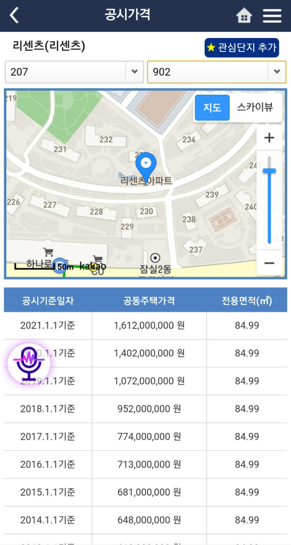 이 중 '공시가격'을 클릭 하면 동검색이 나오고, 해동 동에 소재하는 단지명이 검색됩니다. 이후 동,호수를 선택해 주면 최근 10년치 정도의 공시가격 정보가 나옵니다. 공시가격을 조사하는 기관이 만든 어플이기에 '공시가격' 정보에 대한 신뢰도는 높다 할 수 있습니다.