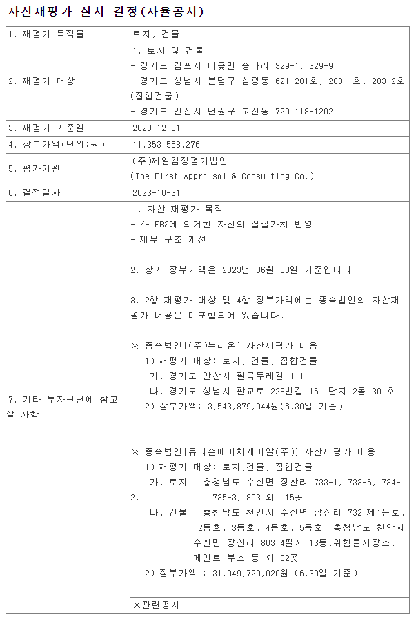 [서울=뉴시스] 김경택 기자 = 도시환경개선 전문기업 누리플랜은 자회사 누리온, 유니슨에이치케이알의 토지·건물을 포함한 자산재평가를 실시한다고 1일 밝혔다. 회사 측에 따르면 재평가 기
