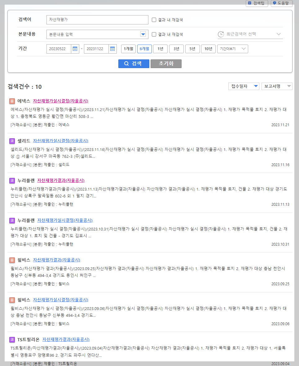 전자공시에 오랜만에 들어가서 '자산재평가'로 검색을 해봤더니, 역시나 유형자산재평가를 결정하는 업체들의 숫자가 늘어나고 있습니다.